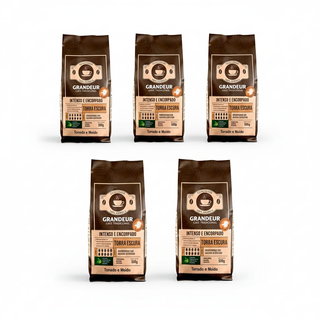 5 pcts - Torrado e Moído - Granulometria Fina - Grandeur Café Tradicional - Torra Escura - 100% Arábica - 500g - Notas Sensoriais Amadeiradas