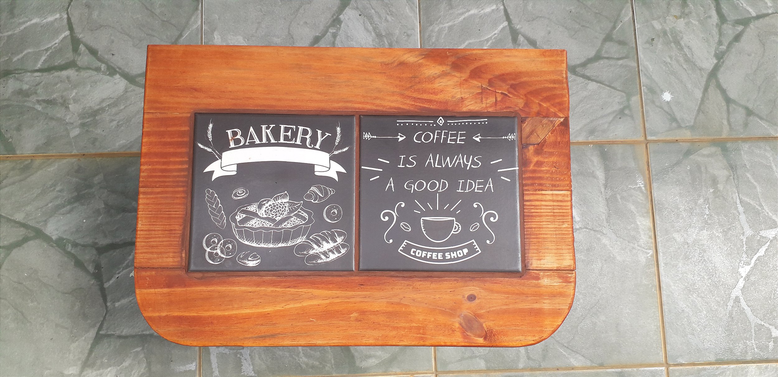 Base balcão artesanal de madeira com decoração em piso de cerâmica.